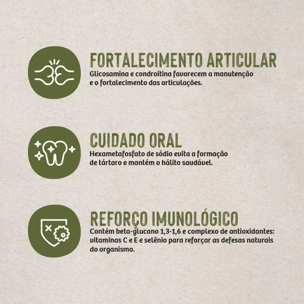 • Suporte para pele, pelagem, articulações e saúde bucal.