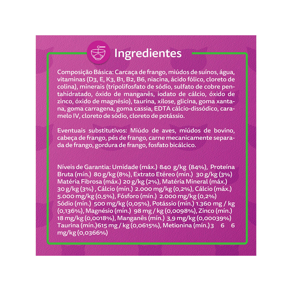 - É um alimento úmido, completo e balanceado feito com um suculento patê cozido no vapor para o seu bichano;